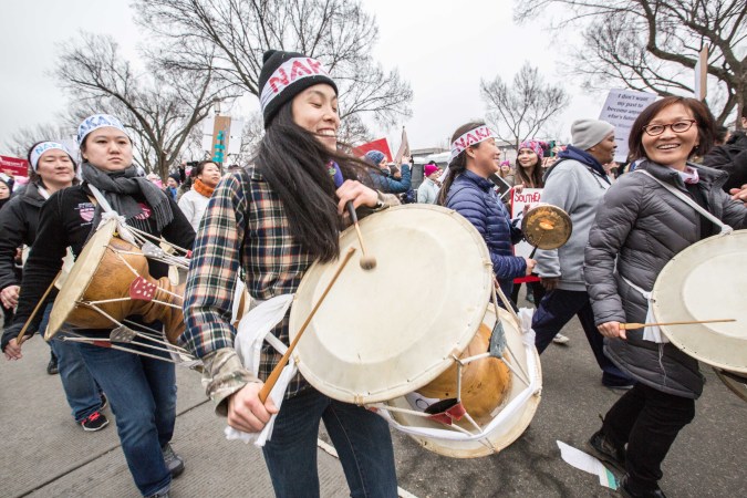 Over the course of the afternoon, we chanted “We need a leader! Not a creepy Tweeter!,” with a group of high school students, and danced with a throng of Korean poongmul drummers. Even as the massive turnout made it impossible to get within earshot of the A-list lineup of speakers, or to figure out where the march began or ended, enthusiasm could not be dampened. Every so often spontaneous cheers and whoops swelled through the crowds. The total lack of cell phone service forced us all to be present.