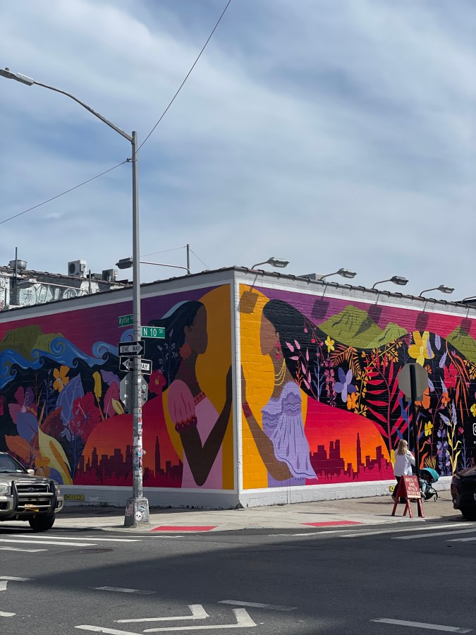 The colorful mural also includes the New York City skyline and an assortment of flowers and plants that flow elegantly through the painted images. For Farinango, she uses her art as “an act of resistance, healing, and self-expression,” which is “heavily influenced by the resilience and strength of matriarchs in her community.”