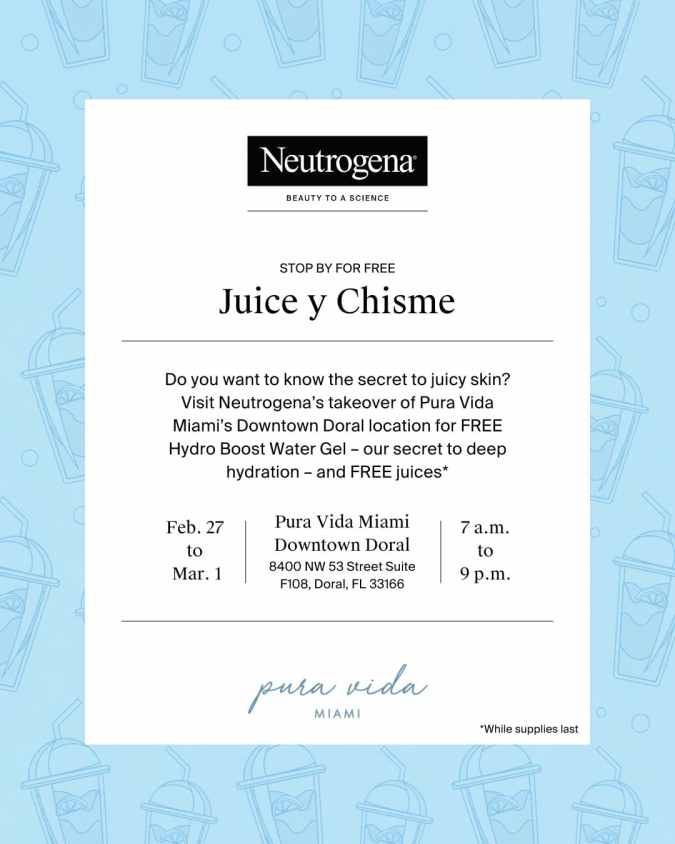 Miami, run, don’t walk! Neutrogena is taking over Pura Vida’s Downtown Doral location for a hydration-filled three-day pop-up that’s all about keeping your skin (and your chisme) juicy. From Thursday, February 27, to Saturday, March 1, you can stop by between 7 a.m. and 9 p.m. to snag some freebies while picking up your favorites from the popular Miami spot.