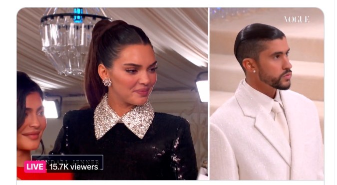 The two stars, who have been reportedly dating, were shown on a split screen together but while they were in different areas of the carpet. As Jenner was being interviewed along with her sisters, Kylie and Kim Kardashian, there was a split-screen shot with Bad Bunny getting photographed. This clever camera work allowed fans to see the two stars “together,” even if they weren’t physically next to each other. Production team, hard at work.