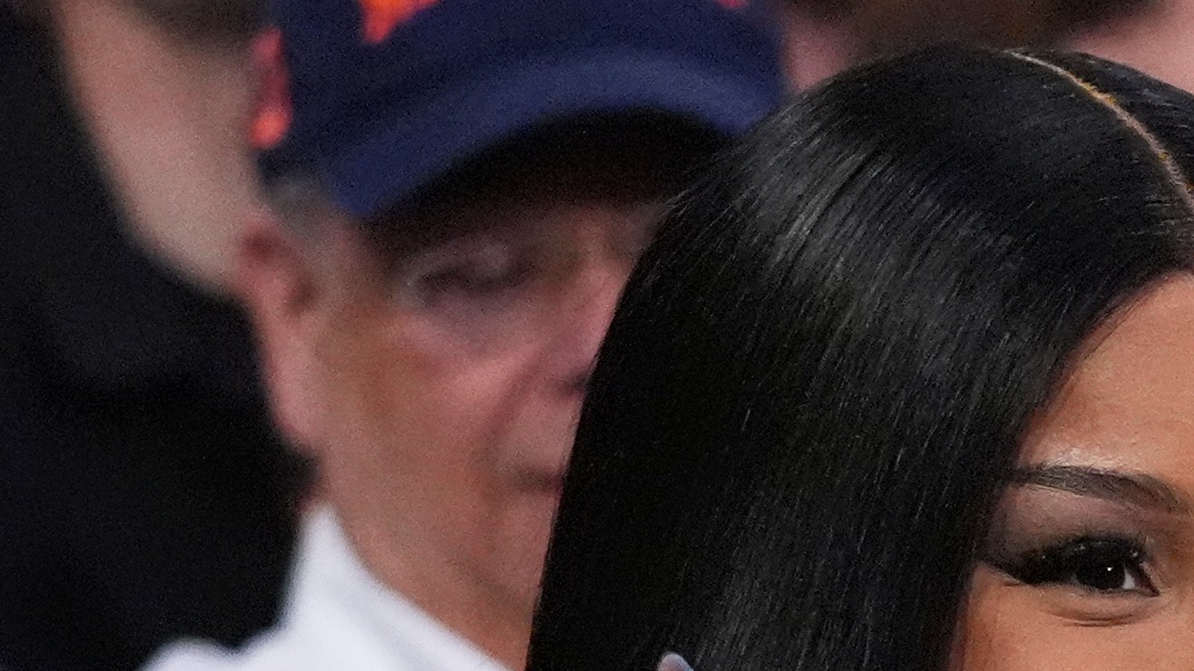 Cardi B poses during the second half of Game 4 in the Eastern Conference semifinals of the NBA basketball playoffs between the New York Knicks and the Boston Celtics Monday, May 12, 2025, in New York. (AP Photo/Frank Franklin II)