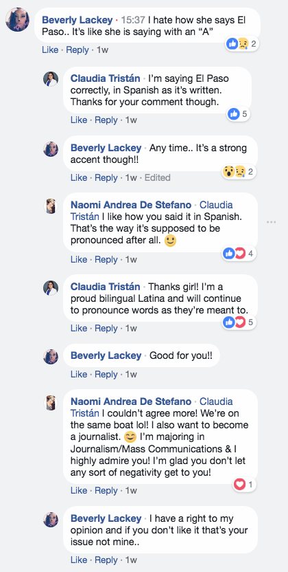 For those of us who can switch between English and Spanish, we’re sometimes faced with that awkward moment where we don’t know if we should pronounce certain Spanish words as they’re meant to be said or with a sort of accent to make it easier for non-Spanish speakers to understand. Yet, many of us don’t have to make that choice in front of a large audience. For Claudia Tristán – a reporter from El Paso for CBS4/KFOX14 – she’s consciously decided not to say words with an accent in English. She pronounces the name of El Paso in Spanish, but some viewers have called her out for that.