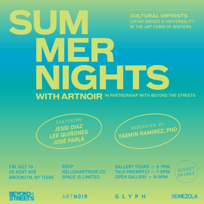 Moderated by Yasmin Ramirez, a research associate at the Centro de Estudios Puertoriqueños at Hunter College who has a Ph.D in art history, the discussion, part of Artnoir’s Summer Night series, will include insights from Jessi Diaz, Lee Quiñones, and José Parla.