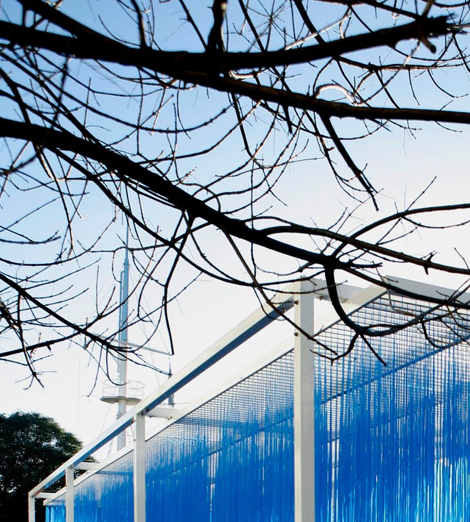 Jesús Rafael Soto, Pénétrable BBL bleu, 1999, Painted steel & suspended PVC tubes, 143 3/4 × 177 1/8 × 551 1/8 in. (365 × 450 x 1400 cm), installation view, Art Contemporain, La Voie des Arts, Saint-Loubouer, 2009, © Jesús Rafael Soto / ADAGP, 2020, photo: Archives Soto. Courtesy of LACMA.