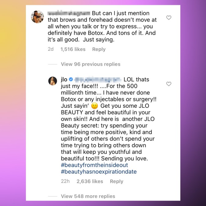 The Bronx native added that she would readily admit if she had used Botox. “If I had, I would say, ‘Yeah, you’re right,’ but I don’t want people going, ‘Stop lying, you’re doing this, you’re doing that,’ when that’s just not true,” JLo adds. “I just felt it had to be set straight, but in a loving way. And one of my big beauty secrets is that I try to be kind to others and lift up other women. I think that that is important for us to do for each other instead of trying to tear people down.”