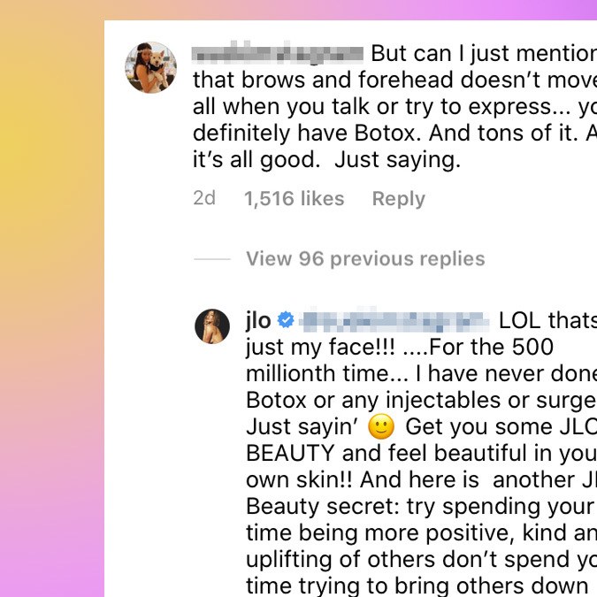The Bronx native added that she would readily admit if she had used Botox. “If I had, I would say, ‘Yeah, you’re right,’ but I don’t want people going, ‘Stop lying, you’re doing this, you’re doing that,’ when that’s just not true,” JLo adds. “I just felt it had to be set straight, but in a loving way. And one of my big beauty secrets is that I try to be kind to others and lift up other women. I think that that is important for us to do for each other instead of trying to tear people down.”