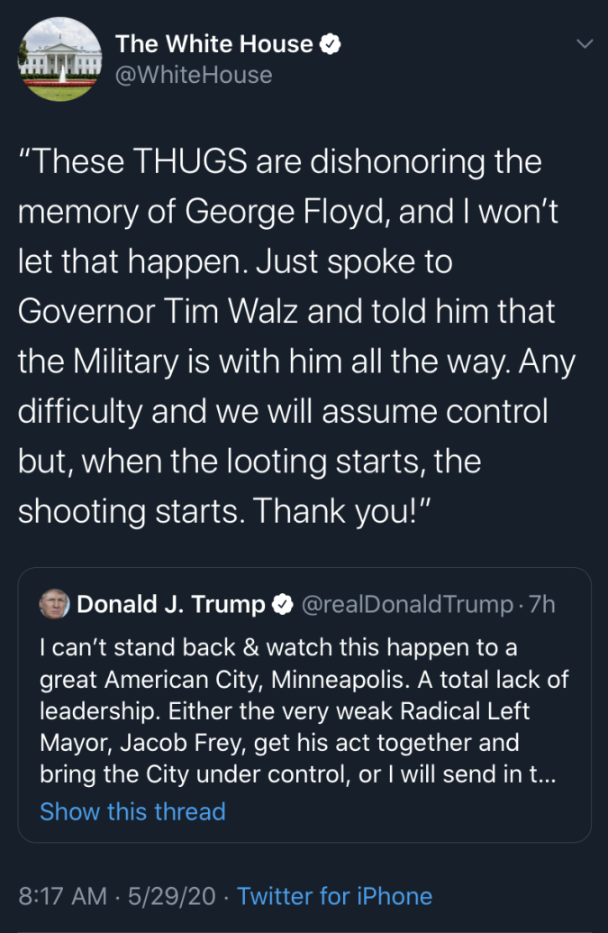 Meanwhile, President Trump encouraged the use of force by police in attempts to tamper protests: “When the looting starts, the shooting starts,” he wrote. The tweet from the official White House account has since been removed.