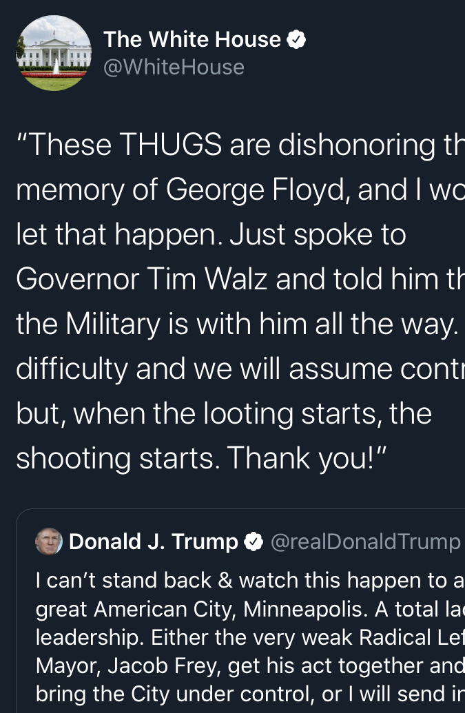 Meanwhile, President Trump encouraged the use of force by police in attempts to tamper protests: “When the looting starts, the shooting starts,” he wrote. The tweet from the official White House account has since been removed.