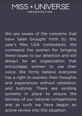 Miss Universe also released a statement on Instagram Stories. “We are aware of the concerns that have been brought forth by this year’s Miss USA contestants. We commend the women for bringing these issues to our attention and will always be an organization that encourages women to use their voice,” it read. “There are existing systems in place to ensure the fairness of our national competitions, and as such, we have begun an active review into this situation.”