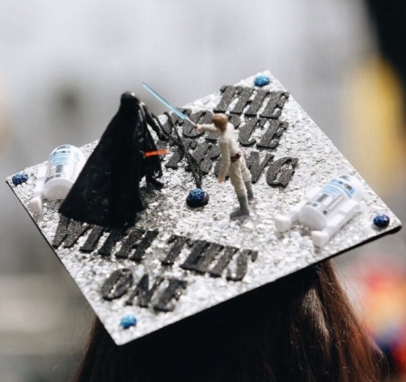 In a sea of uniform graduation robes, caps have become ways for graduates to show off their personalities, shout out their families, and honor their cultures. Alexandra Del Salto, 24, masterfully did all three when she decorated her cap with pupusas for her May 12 graduation. It’s not her first time winning graduation, either. For undergrad, Del Salto recreated a duel between Darth Vader and Luke Skywalker on her cap, so she knew she couldn’t do anything basic now that she was graduating with a Master of Science in Digital Social Media from the University of Southern California. “I feel like since graduation is such a major milestone in one’s life, your cap has to play true to who you are 1,000 percent,” she told me in an email.