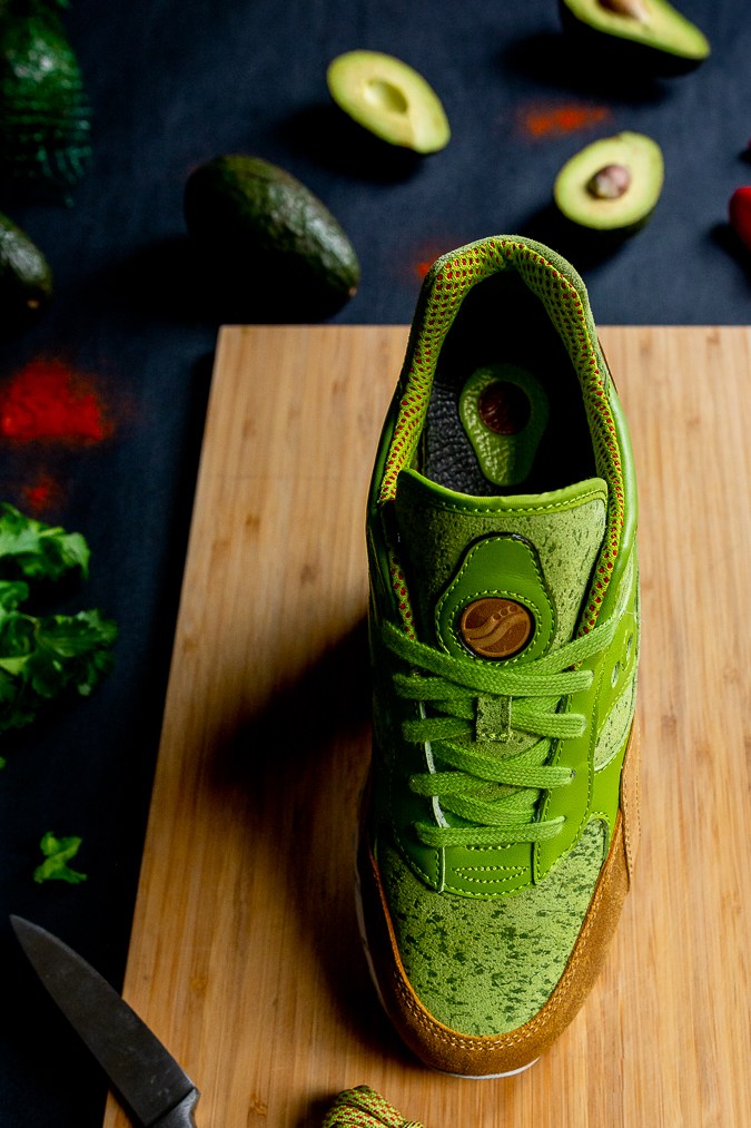 Saucony obviously put a lot of attention to detail in this design. The different textures found on the shoe parallel the fleshy part of the avocado and the pit. And the inside of the shoe is also sprinkled with red dots, which represent spicy chili flakes.