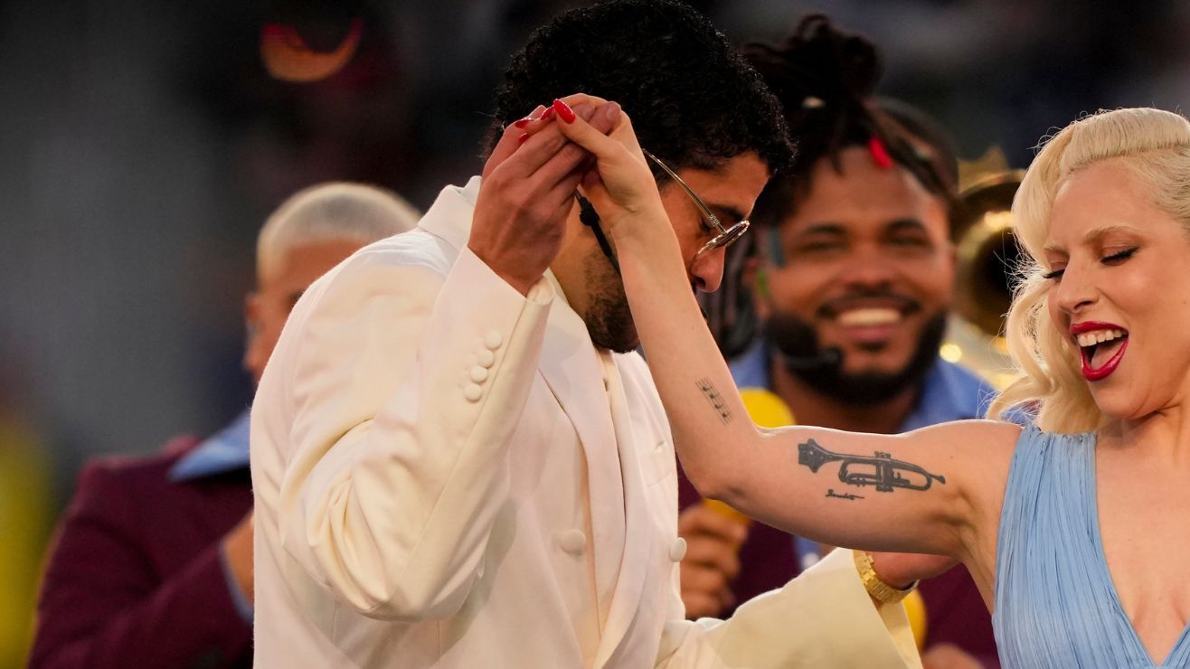Bad Bunny and Lady Gaga perform during halftime of the NFL Super Bowl 60 football game between the New England Patriots and the Seattle Seahawks, Sunday, Feb. 8, 2026, in Santa Clara, Calif. (AP Photo/Brynn Anderson)