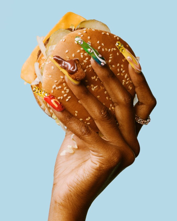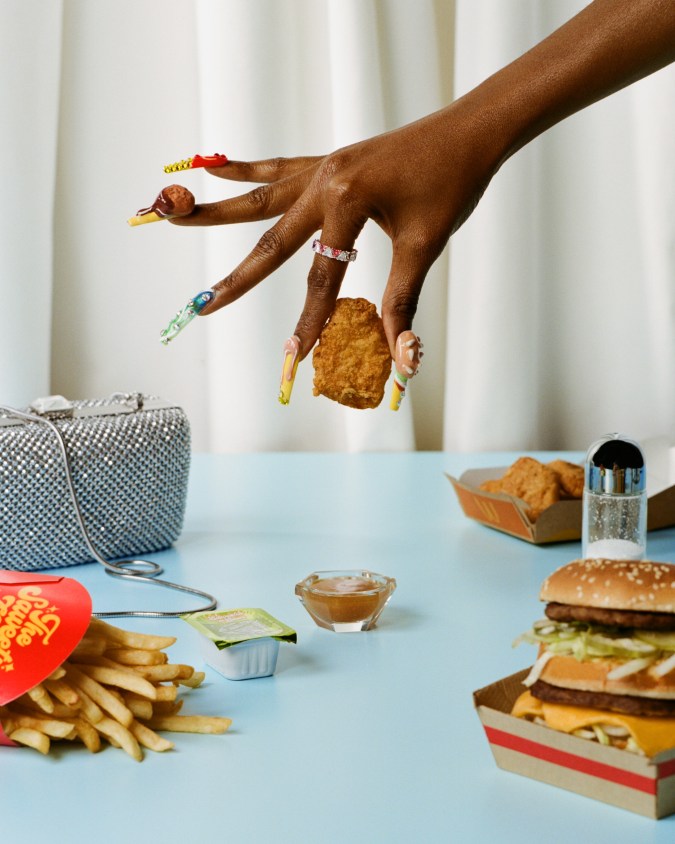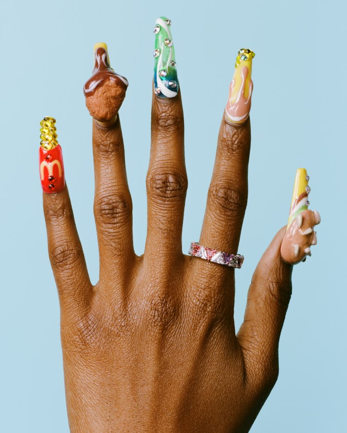 He transformed the pinky finger into a rhinestone-emblazoned ode to french fries, complete with McDonald’s iconic golden arches and a cherry-red pouch made with a trimmed acrylic filed down and adhered over the nail to create the illusion. The ring finger is adorned with a gel chicken nugget dipped in a polygel-color gel mixture akin to McDonald’s signature BBQ sauce.