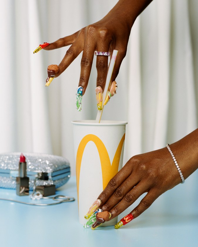 Formally trained in painting and sculpture, Alvear graduated from Cooper Union in New York, where he discovered his natural talent (and passion) for creating otherworldly manicured wonders. His Saweetie set is no different. Alvear wanted his McDonald’s creation to feel playful and elevated, wholly unique and unusual from other food-inspired nails.
