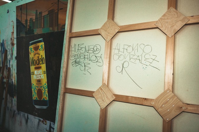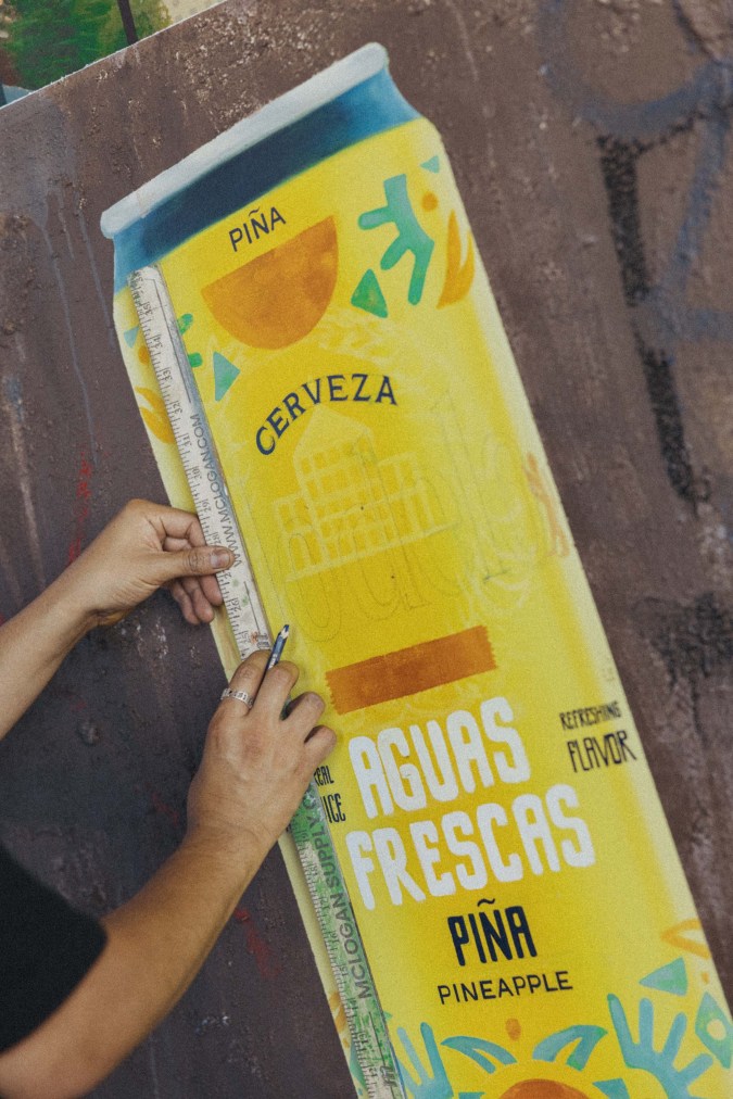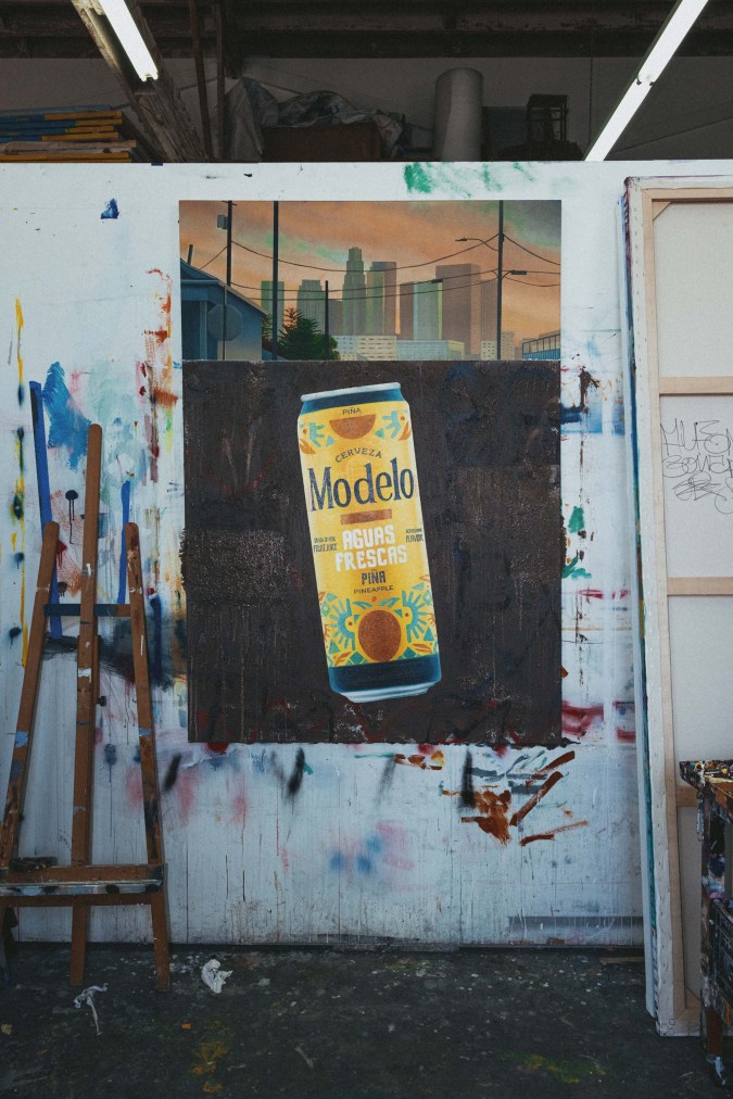 Approaching Modelo Spiked Aguas Frescas as the focus, he transformed his canvas into a glimpse of L.A. through his eyes. The Piña flavor of Spiked Aguas Fresca is at the center of a mural; it’s surrounded by a textured dark brown backdrop that resembles a neighborhood wall decorated and repainted with fading graffiti. Gonzalez Jr. outlines an L.A. neighborhood being watched over by clouds and the city skyline in the distance.