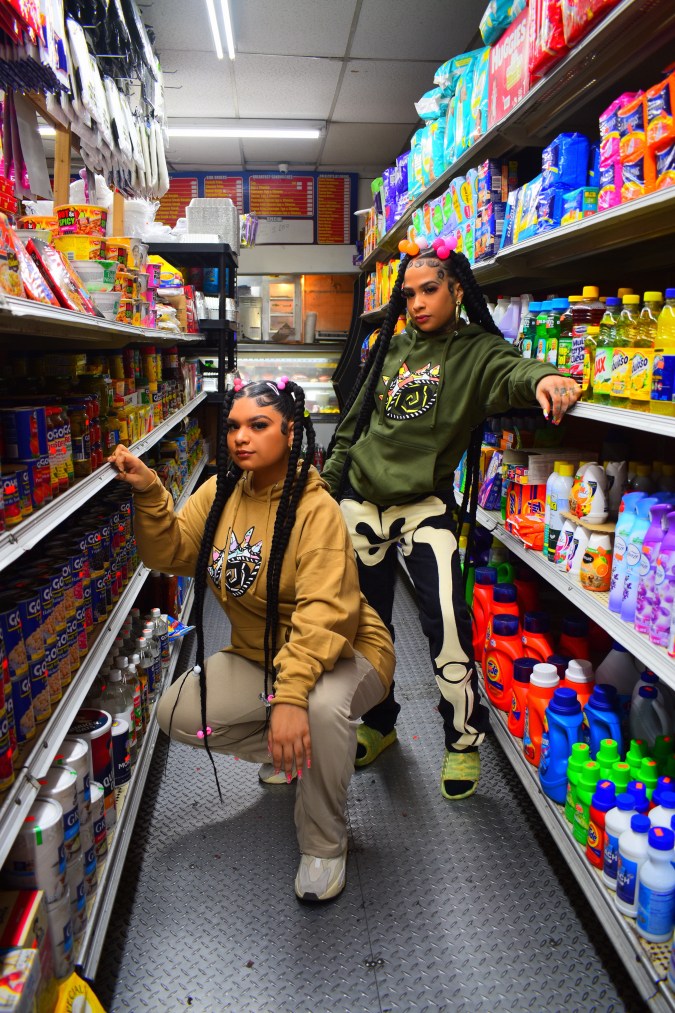 Santana augmented Mota’s statement with her take, “I went to cosmetology school in high school, so I would braid a lot. That’s how I made my money before selling art. The concept for the shoot was about aspects of Dominican culture on the East Coast, like going to bodegas, hair salons, and wearing braids [similar to] how my mom would do my hair as a kid–we call them dookie braids, one big braid at the top and two in the back. Then we shot it at a salon and bodega that Jennifer’s aunt and dad own, so it felt natural to be around that environment and what I was familiar with growing up.”