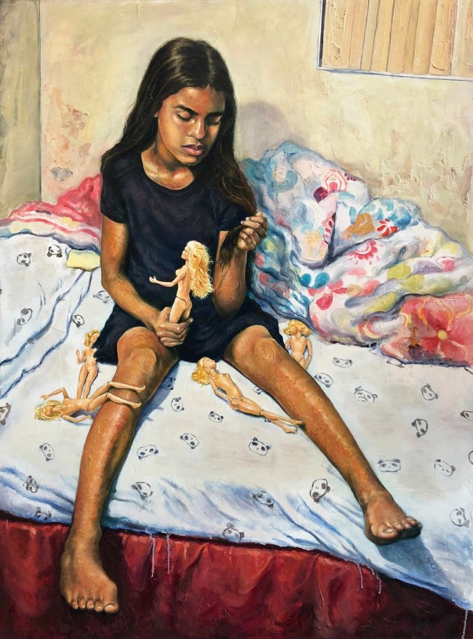 On social media, she slowly started to share more vulnerable stories about her childhood and the inspiration behind her artworks. In “Am I Too Dark,” Cruz depicts her younger sister sitting on a bed with a doll in her hand and others strewn around her. She holds a lock of her hair and looks thoughtful and dejected. The painting expresses Cruz’s own struggles growing up as a woman of color.