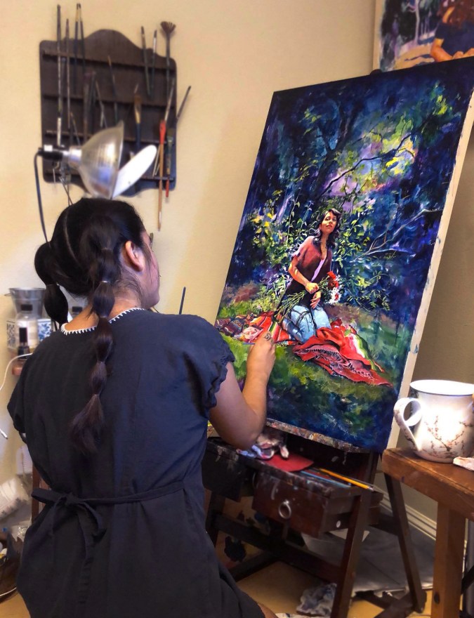 Her paintings’ environments largely focus on the outdoors, a space that Cruz sees as a balm for many women of color.