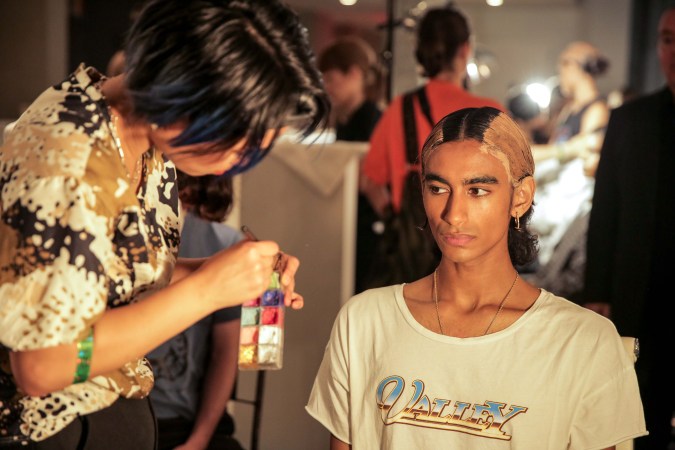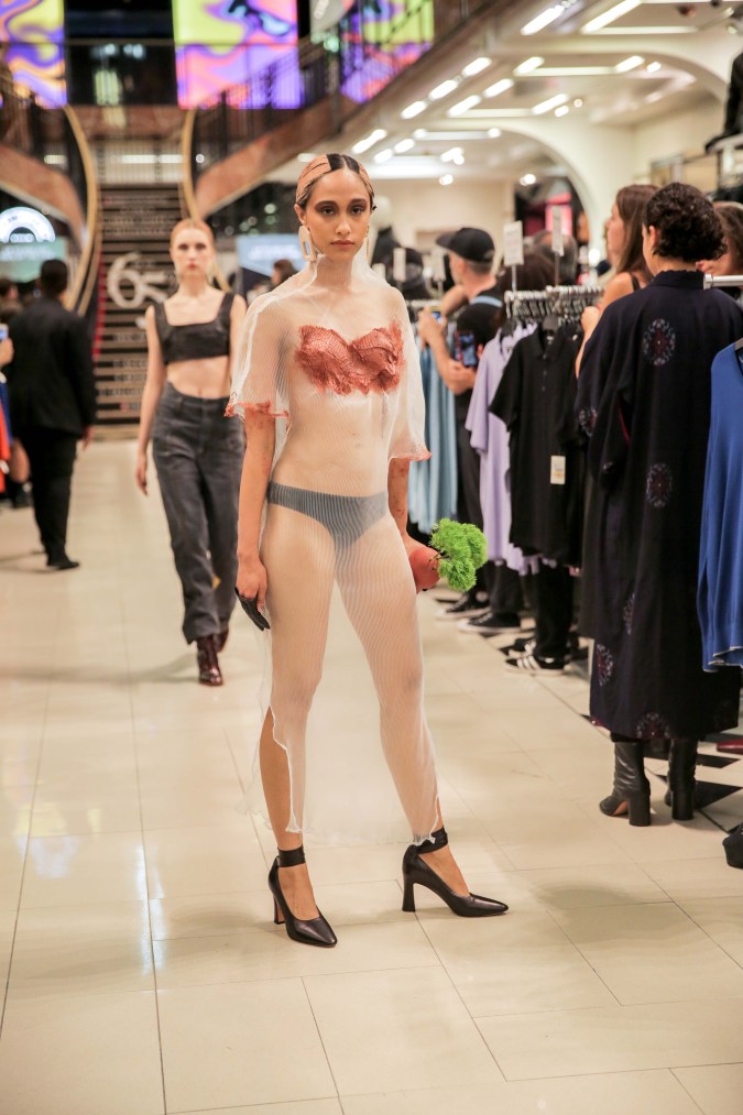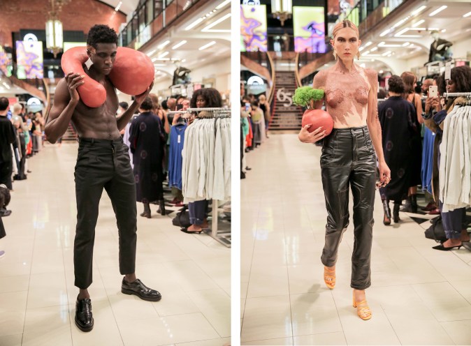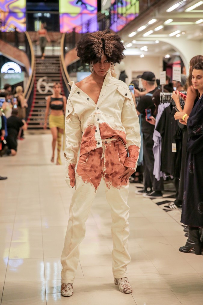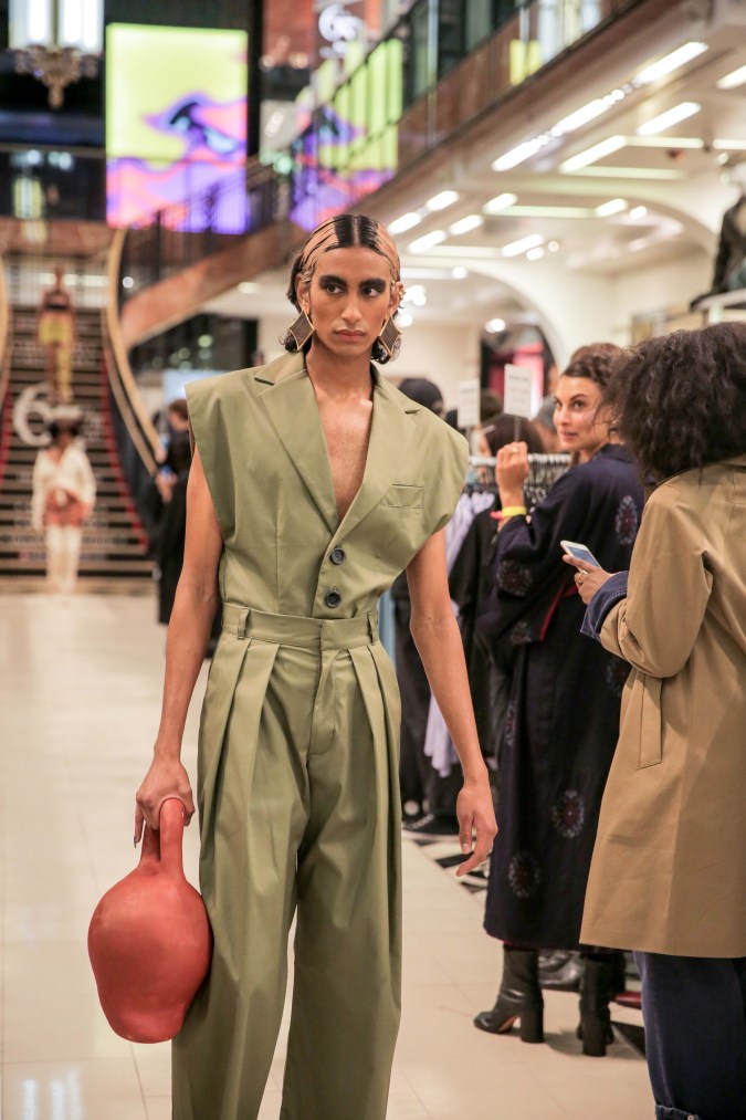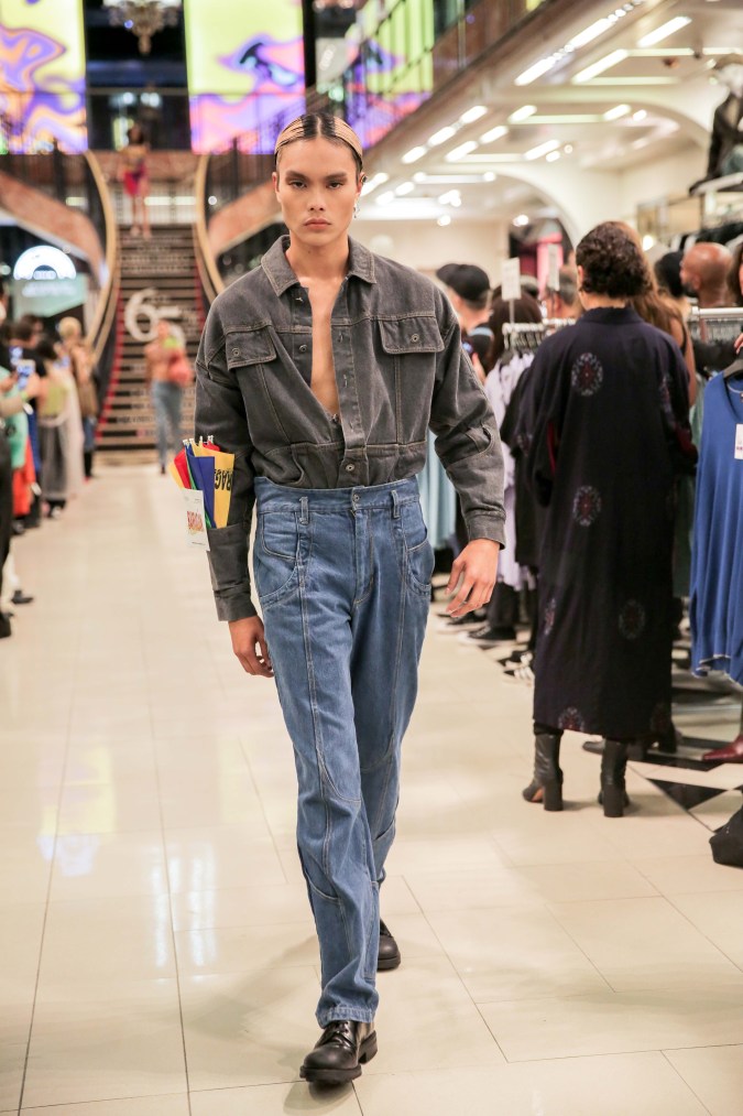 As New York Fashion Week came to a close, Mexican designer Victor Barragán showed a 23-piece Spring/Summer 2019 collection on Wednesday that explored the fluidity of gender, contrasting highly sexualized clothes with the androgynous nature of denim. The looks in “Terracota” were all in earthy tones such as grey, green, and, yes, terracotta with an early aughts nostalgia resemblant of mall culture. (It’s probably why the show took place at a Century 21 in Manhattan’s Financial District.) And yet with all that on display, Barragán stayed true to the deconstructed execution that has made his brand a staple of the streetwear scene for several years now.