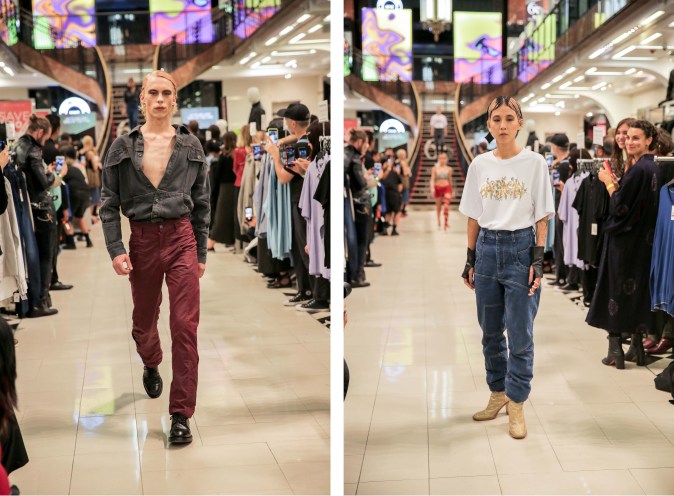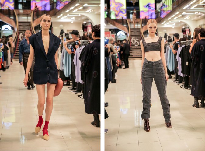 There was no shortage of Barragán’s signature nostalgic aesthetic. The denim jackets were worn off-the-shoulder. The mini skirts’ hem spiraled down the legs, similar to the way a cobra bracelet wrapped around a wearer’s arms in the early 2000s. And T-shirts came in two sizes too big in that good kind of oversized style that elevates someone’s cool factor. The jeans were also oversized and high-waisted with uneven seams at the hips and ankles, proving deconstruction is the key word in Barragán’s mission statement.