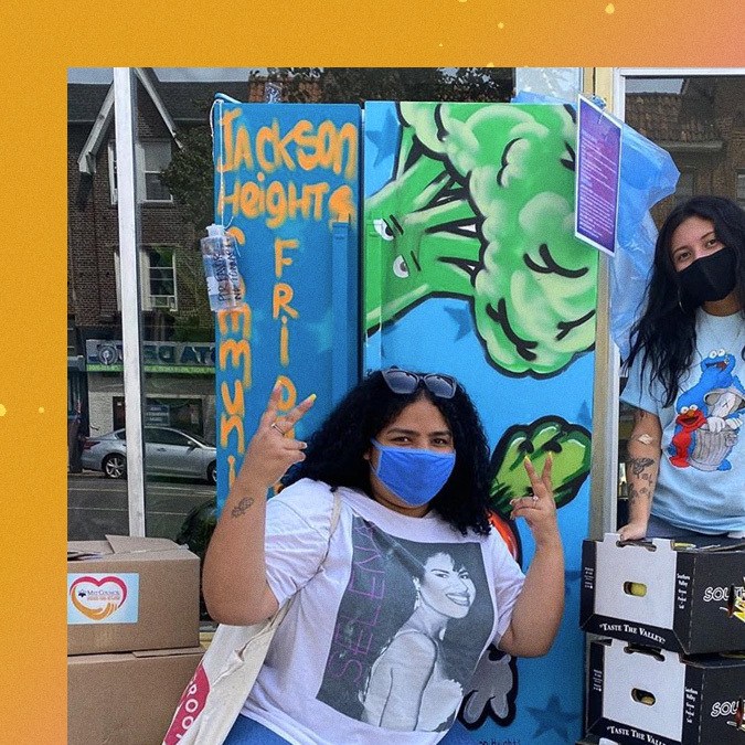 On the corner of 80th St. and Northern Blvd. in the Jackson Heights neighborhood of Queens, New York, sits an eye-catching refrigerator. Painted blue with larger-than-life drawings of fruits and vegetables, the vibrant display invites folks to take and drop “free food.” Inside, its shelves are stocked with fresh carrots, tomatoes, lettuce, cilantro, cassava, potatoes and ginger—all donated by local restaurants, supermarkets and everyday people hoping to feed their neighbors.