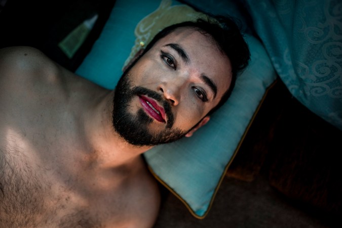 “Destiny is my transvestite side,” they say with a tinge of secrecy. “I discovered her twelve years ago when I was exploring my femininity and cross-dressing with a friend.” Macías doesn’t share much more about Destiny, except that when money was hard to get by, sex-work helped them survive. Destiny has gone through many phases, they say scrolling past dozens of photos on their Instagram—from clean-shaven and discreetly cis-passing, to having a full-beard and extravagant make-up. But what remains constant is that “she’s slutty, always showing her thighs and ass,” Macías says with a laugh, filling the room with their always-spontaneous sense of humor.