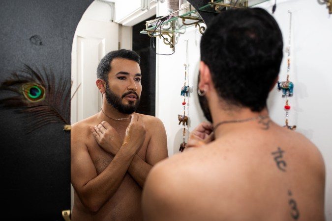 Even as Macías’ home is much more of a spiritual-hippie crib, they reserved one entire room as a walk-in closet for make-up kits, dresses, stiletto heels, long leather boots, necklaces, wigs and mirrors. An hour or two later, when the seco de chivo has been served and everyone has eaten, Macías comes out of this room wearing a short black nightgown, their eyes popping from the dark eyeliner to match their long black hair and full beard.