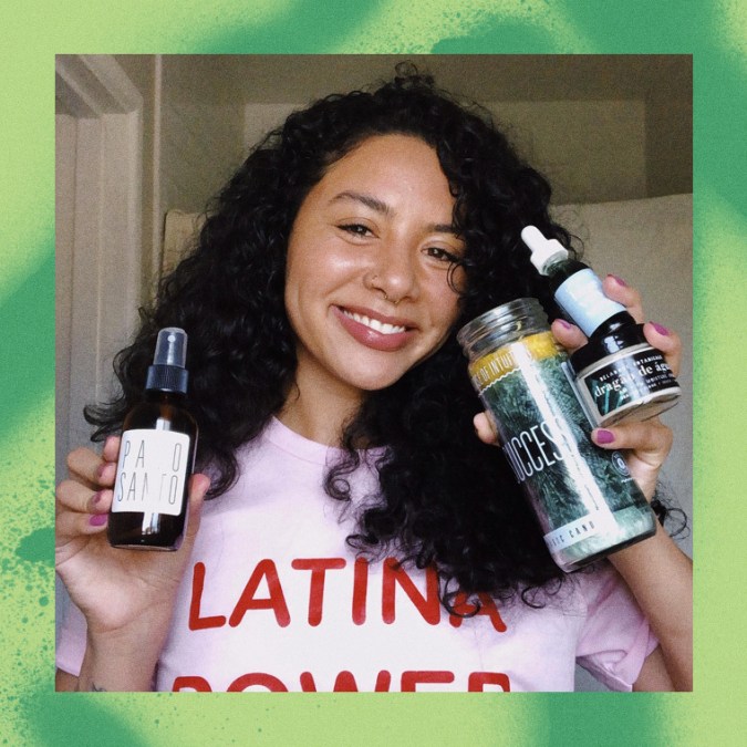 I’ve been ordering products on Shop Latinx. We have this brand called Bela Doce. It smells like I’m on an island. There’s this facial cleanser and blue serum — it smells like the ocean. It’s so nice. My whole face routine has been this Bela Doce brand. Organic, sustainable ingredients — they’re just so good. I also use Burt’s Bees pomegranate chapstick. I like my lips feeling moisturized all the time, but also I like the hint of pink or rosiness. I’ve been taking a lot of bubble baths. It’s my “me time” because my phone and email go off constantly. I’ll listen to a Spotify playlist and light my House of Intuition candles. We just added bath bombs to our marketplace. I’ve been using those to relax. I’ve been trying to go pretty natural in terms of makeup. Curled lashes and eyebrow gel — my eyebrows are looking crazy. And then chapstick and this cream highlighter I put on my cheekbones and there we go, I call it a day.
