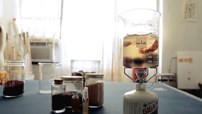 These experiments have become a key ingredient to Fragmentario’s recipe, inspiring a horde of strangers and friends from all parts of the world to send her bottles of water from their respective countries. Pombo then examines the water with a pH test strip that shows her the chemical levels contained in the water. It’s her way to play with natural ingredients to develop new colors without relying on synthetic dyes. The crowdsourced water is also a way for Pombo to reach artists who would otherwise be intimidated by science. Her engineering background has come in handy with this project, as she helps other people see the scientific side of fashion.