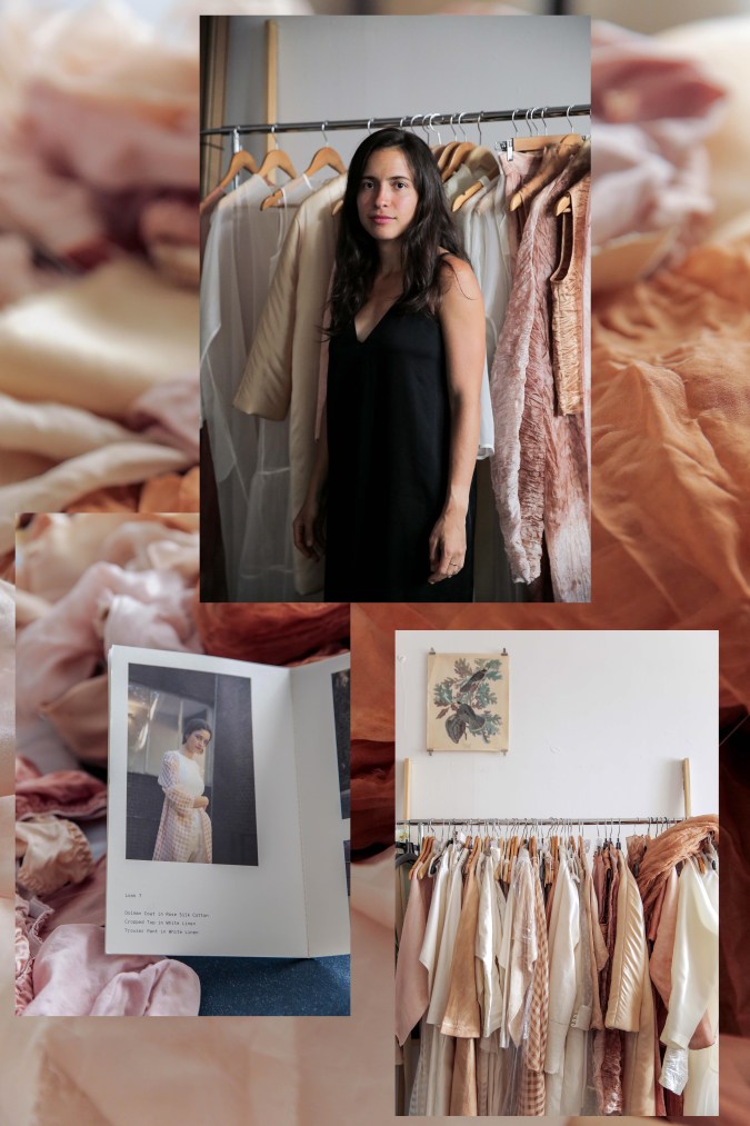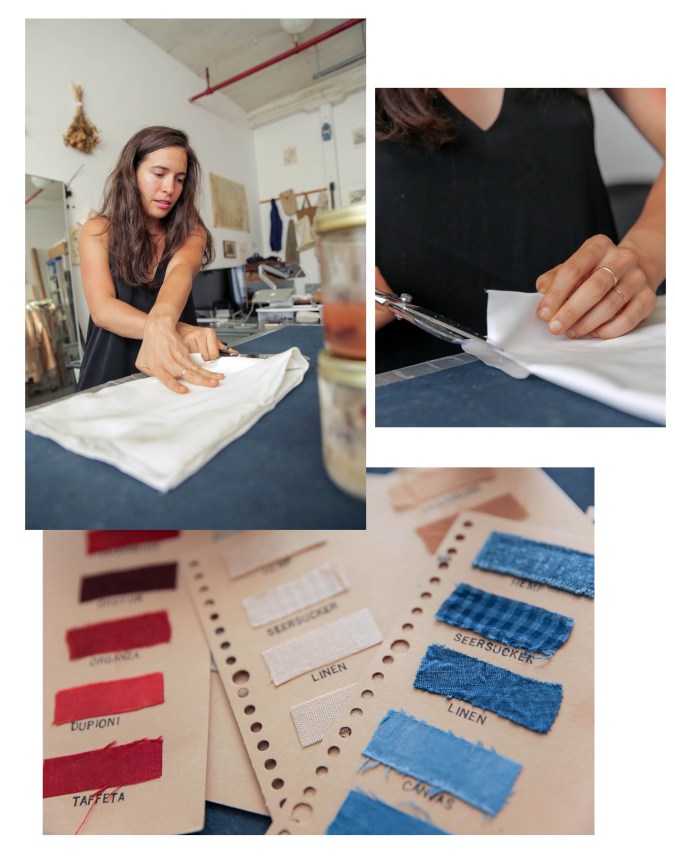 The designer, who did a postgraduate program in fashion design from Parsons The New School for Design, opened her studio in 2016. But she has experimented with natural dyes since 2014. Her incursion into this field was accidental. When her partner, Griffin Moore, created his tote bag line, Native Outpost, the two set out to find the right shades of color to feature in the collection. But after they grew frustrated with the fabric and color options available, they turned to natural dyes to DIY it.