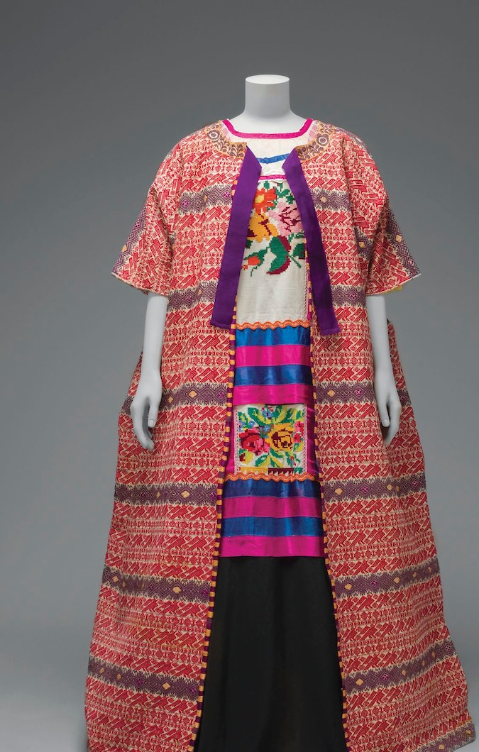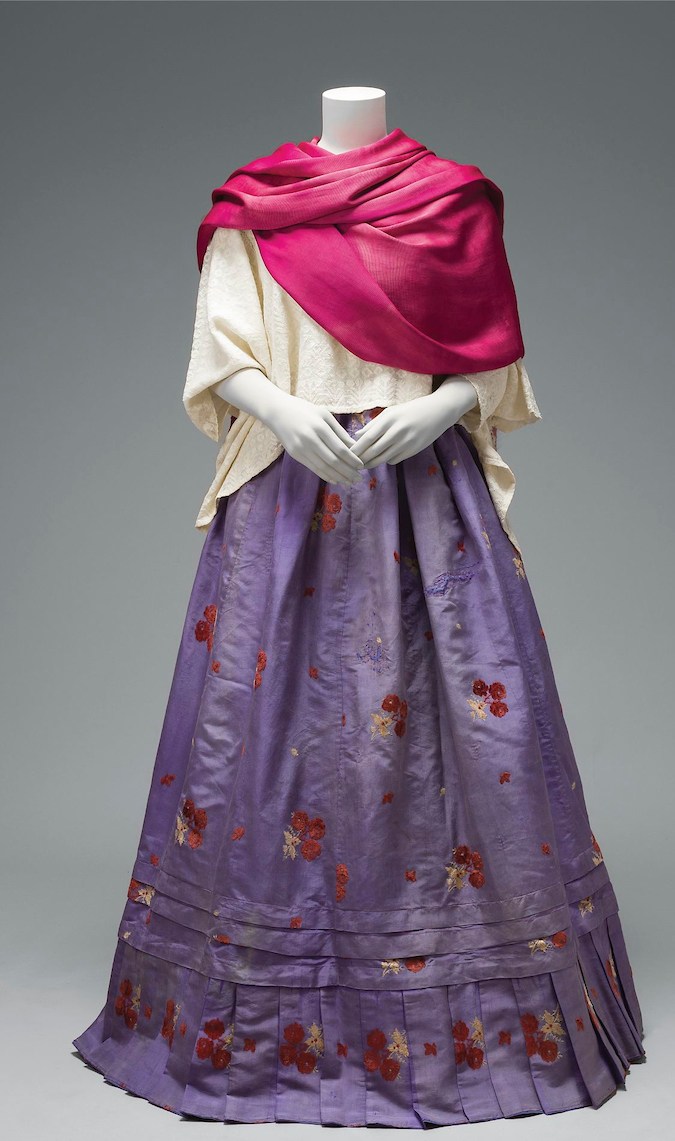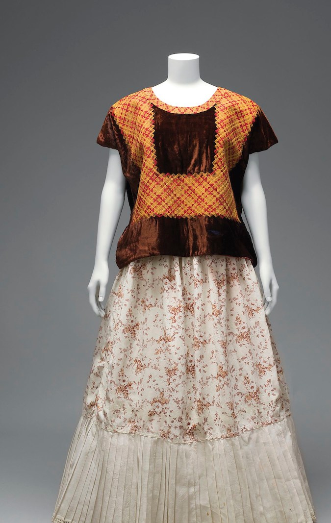 Additionally, Kahlo had seamstresses and provided them with designs that attempted to recreate the Tehuana aesthetic using both traditional and contemporary fabrics. Due to the arrival of the Singer sewing machine at the start of the 20th century, varying differences between hand and machine-made embroidery help date pieces and tell where her clothing was made.