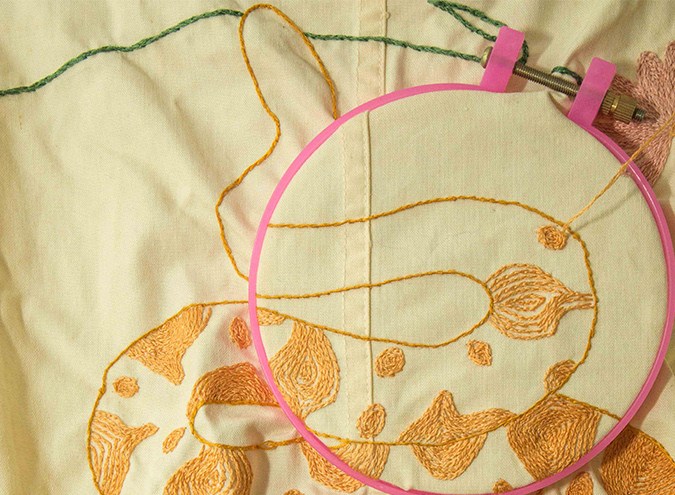 Last year, as she prepared to show in Santiago de Chile, she sought to create something that could easily travel from one country to the other. So she began experimenting with printing her drawings onto fabric and tapestries, which she then embroidered. It’s something she hopes to do more of in the future.