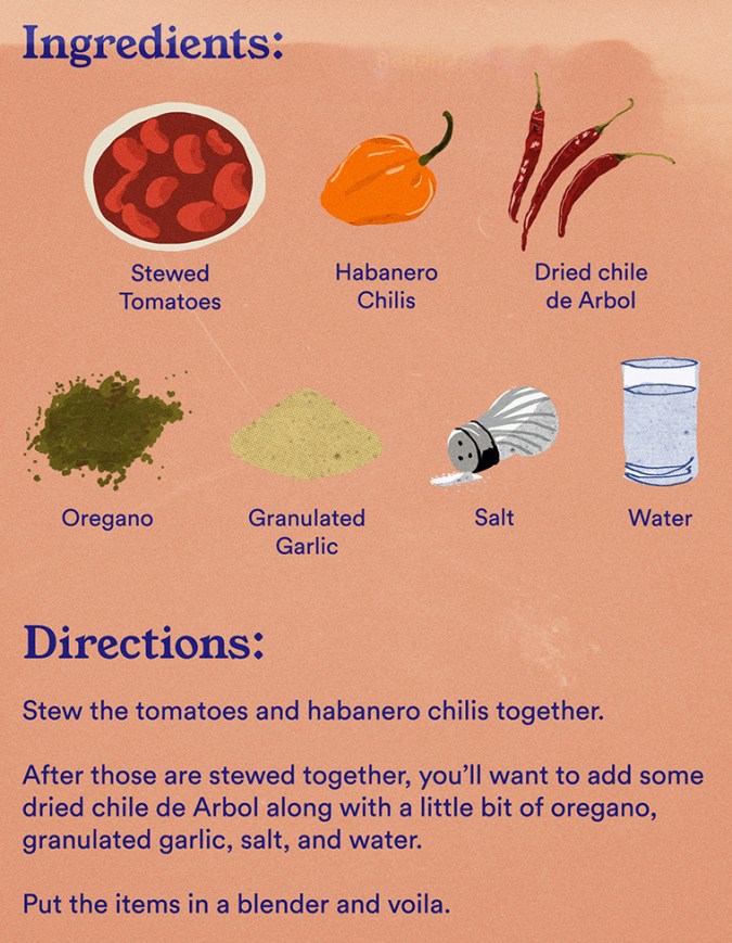 Those in LA can support Flores by ordering from Juanitas during their limited hours of 8 a.m. to 5 p.m. You can also tune in to their Instagram and Facebook for more. In the meantime, here’s a rough recipe for hot salsa from Flores, which you can make wherever home is: