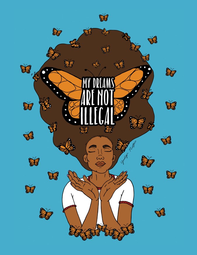 From the steps of the Texas Capitol to the second annual Women’s March in Washington DC, the work of artist Yocelyn Riojas has made appearances at protests across the country. Her art represents the plight of undocumented immigrants, particularly Temporary Protected Status (TPS) holders and Deferred Action for Childhood Arrival (DACA) recipients. In one of her posters, an Afro-Latina woman is set against a bright blue backdrop adorned with monarch butterflies in her hair. Between the wings of the largest butterfly, the poster reads, “My dreams are not illegal.” Through her art, she has equipped the resistance with imagery as powerful as their stories.
