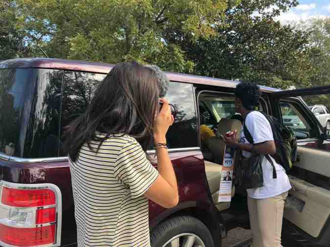 Jane: At the office we set up our gear, had them sign the consent forms that we have all our subjects sign, and just got to know them so that they would feel comfortable being on camera. We learned that Laquacia is a marine veteran, Angela is a former law enforcement officer, and Elijah is a young man who is currently in the Army Reserve. All our canvassers have really diverse backgrounds, which I think makes a difference when it comes to connecting with voters.