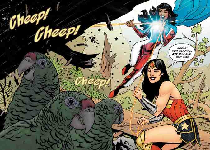 Written by Dawson and David Atchison and illustrated by her tío, “¡Pa’Lante!” finds a sorrowful Borinqueña reflecting on how she couldn’t protect her people – a feeling that many must have felt in the aftermath of the storm. The heroine finds Puerto Ricans breaking into a heavily secured facility filled with boxes of supplies, including medicine. Frustrated by the lack of urgency, the men broke in to steal these provisions, but La Borinqueña reminds them that their actions will hurt others who also depend on these items. Offering to help them get the medicine they need, the strip ends with a powerful quote: “Too often we are treated like second-class citizens, but that isn’t who we are. Never has been. Never will be.”