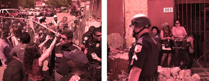 For nearly two weeks, community members have camped out in front of the damaged Duranguito buildings. Fearing the property owners will begin demolition at any given moment, they have refused to leave. Many community members claim that it is in the property owners’ best interests to pay the fine for disobeying the cease and desist order so that they can sell the land to the city of El Paso as soon as possible and thus commence the construction of the proposed arena. Quintero notes the city’s complicity in this. “The city officials are trying to absolve themselves from any destruction caused by Duranguito property owners, but we know that it is in the interest of the city and their private investors that property owners demolish this site to sell the land to El Paso.”