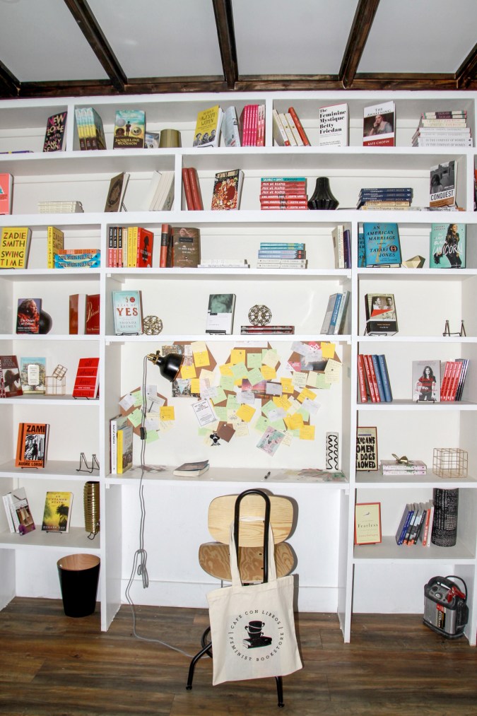 Close to 200 woman-penned books color in the shop’s white walls. The bookstore, with natural light pouring into its corners from the mostly glass storefront, is about two arm spans wide. The air’s brimming with music loud enough to get you dancing in your chair, but still quiet enough to get work done.