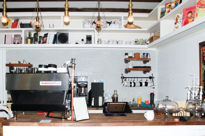 A silver espresso machine takes up almost half the back counter where customers order their pick of coffees, teas, and the pastries visible under a glass cake stand cover. Everything’s deliberately priced $4 and below, and purchased from locally owned businesses.