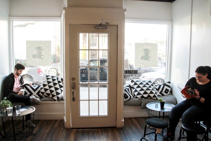 Sitting on opposite sides nestled in the reading nooks under ceiling-scraping windows are three women of different backgrounds, reading and typing away on laptops. Moments ago, a man in a leather jacket walked in for a coffee and quick hello.
