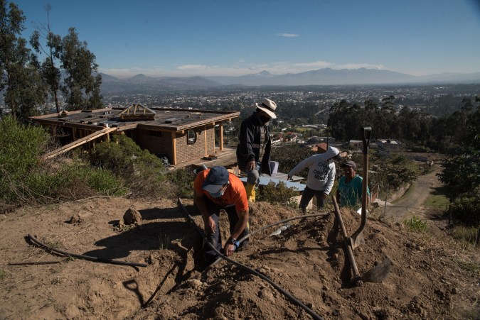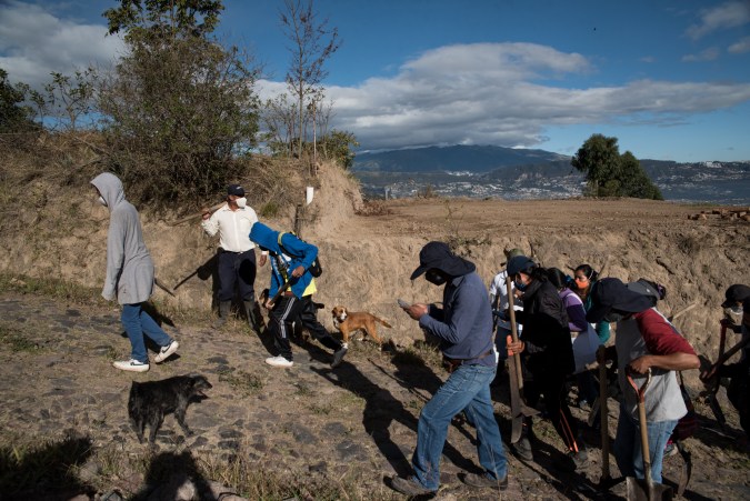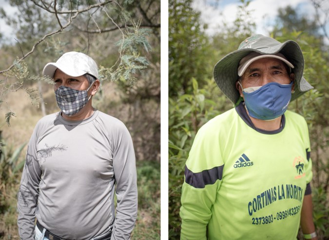 Gerardo Simbaña, a lanky man with long black hair in an Andean-patterned white shirt and a Gucci cap, assembles old and young under the shade of tree leaves after their temperatures are checked and hands sanitized. Split into groups, he sends them off to dig the dry crumbly soil for five hours straight so they can install an irrigation system that will allow commune members to water their own fruit and vegetable gardens.