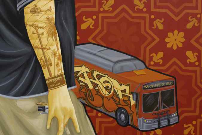 Yet, despite this preservation of tradition, culture is not fixed or stable – and the “Visualizing Language” murals convey this evolution. The works create a dialogue about the contributions of Zapotecs in L.A. and depict an Indigenous community that’s not idealized or static. “One of the main principles of Tlacolulokos is to avoid idealizing ourselves and avoid idealizing Oaxacans. The construction of our identity is always in flux,” explains Dario Camul, a member of the collective, at a recent talk held in the library. Through symbols like tattoos, 40z bottles, and brands like the L.A. Dodgers or Adidas, we see the story of migration.