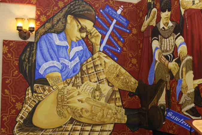 While Oaxacan immigrants tend to preserve their culture, appropriating these symbols is a form of survival when faced with the isolation of being in a foreign place. In one mural, we see a woman full of tattoos with Indigenous garments sitting in front of street signs spelling out the names of various Oaxacan enclaves in L.A. like “Oaxakoreatown” and “Santa Monica 13.” Above the neighborhood nicknames, the sentence “A place as big as your suffering” welcomes you to what the city can represent to immigrants. “The murals talk about the challenges of migration, how people cope with those challenges, who embraces you, who protects you, how do you protect yourself,” explains Dr. Flores.
