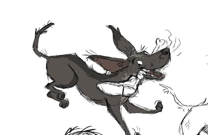 Directing animator Nick Rosario says the wrinkles on Dante’s body helped them “push the cartooniness” of the character. “There’s a lot of great deformation going on,” he says. Yet, in spite of the dog’s unconventional attractiveness, the animators wanted it know that Dante wasn’t inspired by previous Ugliest Dog contest winners. The reference to Tramp in Lady and the Tramp is apropos. “Dante is a street dog [so] he’s got a lot of bumps and scratches,” according to Hoffman. Having a character who’s seen some lumps helped the painters get creative with how Dante is colored. You’ll also notice that Dante’s ears have rips and breaks in them, further proof of his rough time on the streets. He also doesn’t have the training of most house dogs so “he’d never sit up on his hindquarters” according to Rosario.