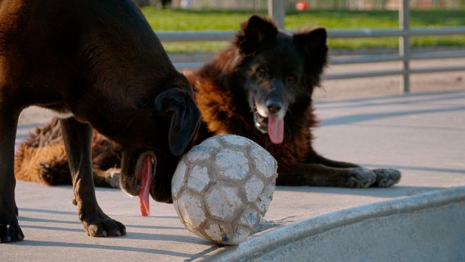 Of course it’s unavoidable to watch Los Reyes without forging narratives about what the dogs might feel or think at any given moment, and the film is not without its “aaaaw”-inducing moments (think a low shot looking skyward from the bottom of a skate pool as the two peak their heads out over the edge). But in its sober appreciation of Fútbol and Chola, and their remote and unspectacular existence, there is something simultaneously sad and joyous to the movie’s spotlight on their companionship. And it’s precisely this complexity of feeling that makes Los Reyes one of the most rewarding dog movies I’ve seen to this day.