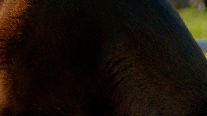 Whether lounging at the edge of a halfpipe or chasing away horse-mounted cops from their kingdom, Fútbol and Chola’s routine existence is captured with patience and attentiveness by cinematographer Pablo Valdéz. High altitude shots overlooking the domain situate the two pups in the context of Santiago’s valley-contained cityscape, two furry figures protruding from the park’s flat expanse like the button insects clinging to the tufts of Fútbol’s unwieldy mane. While the camera keeps a cool distance from the dogs as they space out and find ways to pass the time and cool off in the midst of the dry Chilean summer, Valdéz uses high definition macro to bring us at times uncomfortably close to the subjects. Muzzles and paws resemble Extra-Terrestrial textures, and frayed tennis balls coated in gunk and dirt look nearly existential in their weathered state. Yet when one ratty tennis ball disappears, a new one takes its place, and so on and so forth — mundane recurrences like this and Fútbol’s obsessive habit of picking up rocks and balls and cans and holding them in his mouth, underscore the movie’s interest in the seemingly insignificant, the lazy cycles that comprise a freed existence for animals that know nothing else but that.