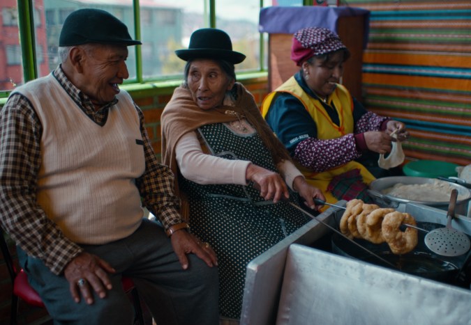 Another postcard from Bolivia’s capital shows Cristina Zurita, an Indigenous woman who has specialized in the sandwich de Cholita—popularized by its namesake, the pork sandwich is topped with escabeche and a special sauce. Despite her 57 years in the business, she speaks of the joy she still feels watching regulars bite into each sandwich she makes. Constantina Velazco and Carlos Suaznabar, a couple who have specialized in the regional take on fried bunuelos for 50 years, share how they started with nothing and built up a restaurant specializing in the fried dough disks, meanwhile a local cinnamon ice cream vendor speaks of how climate change and the passing of time has affected the way in which this treat is crafted and enjoyed.