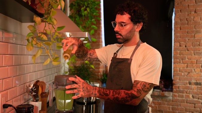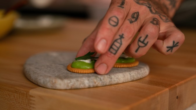Don’t think for a second, however, that just because Herrera and others use avocado in their version means that guasacaca is another type of guacamole. As Herrera puts it, “[guasacaca] is even better than guacamole.” He adds other ingredients to his sauce, too, like green bell pepper, serrano pepper, spinach, distilled white vinegar, lime juice, olive oil and black pepper. He has a box of RITZ Crackers ready for the final presentation, too.