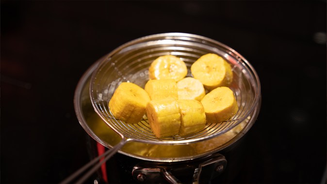- Fry the plantain pieces in 3 cups of vegetable oil for about five minutes in a small pot over medium heat at 350 degrees. The plantains would be submerged.