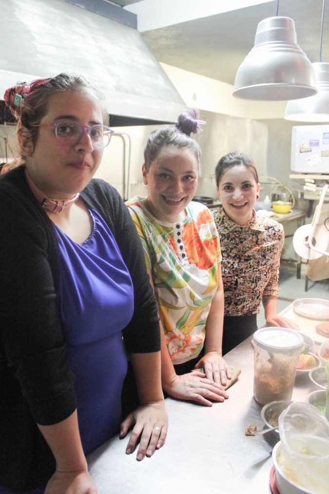 Inés rhapsodizes with the virtue of some sort of Gen X punk savant. Her hair is parted down the middle to highlight the long neon pink strands that flow over her right shoulder. A fierce septum piercing stands at a contrast to girlish purple glasses, and she sports a pair of shiny black leggings. Her partner, Jorgelina Mandarina, does too except her leggings are an acid trip kaleidoscope of space and color that are impossible to tear your gaze away from. Guadalupe Alpuin, who rounds out this cooking trio, has her hair pulled back tightly to show off her shaved sides.